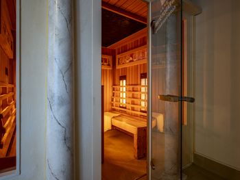 * Saunalandschaft mit Blockhaus-Saunen, Dampfbad, Salzgrotte, Ruhe-Pavillon mit Blick zur Liegewiese, Raum der Stille mit temperierten Wasserbetten, Tee-Lounge mit Kamin