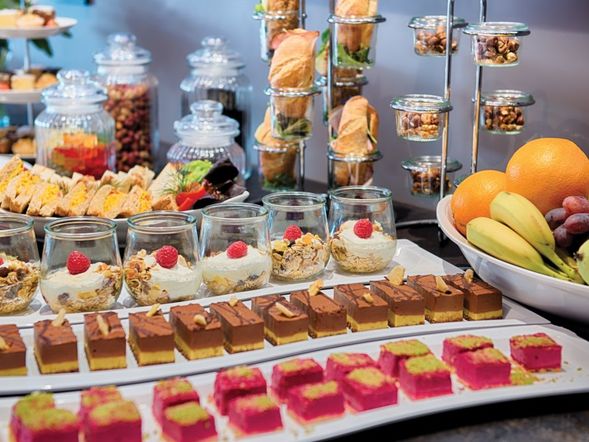 Es stehen verschiedene gastronomische Einrichtungen zur Auswahl, wie ein Nichtraucherrestaurant, ein Speiseraum, ein Frühstückssaal, ein Café und eine Bar. Die Unterkunft bietet als buchbare Verpflegungsleistung Übernachtung inkl. Frühstück. Täglich werden ein kontinentales Buffetfrühstück und Mittagessen serviert. Diätgerichte und Kindermenüs werden auf Wunsch zubereitet. Darüber hinaus stellt das Haus spezielle Verpflegungsangebote bereit.