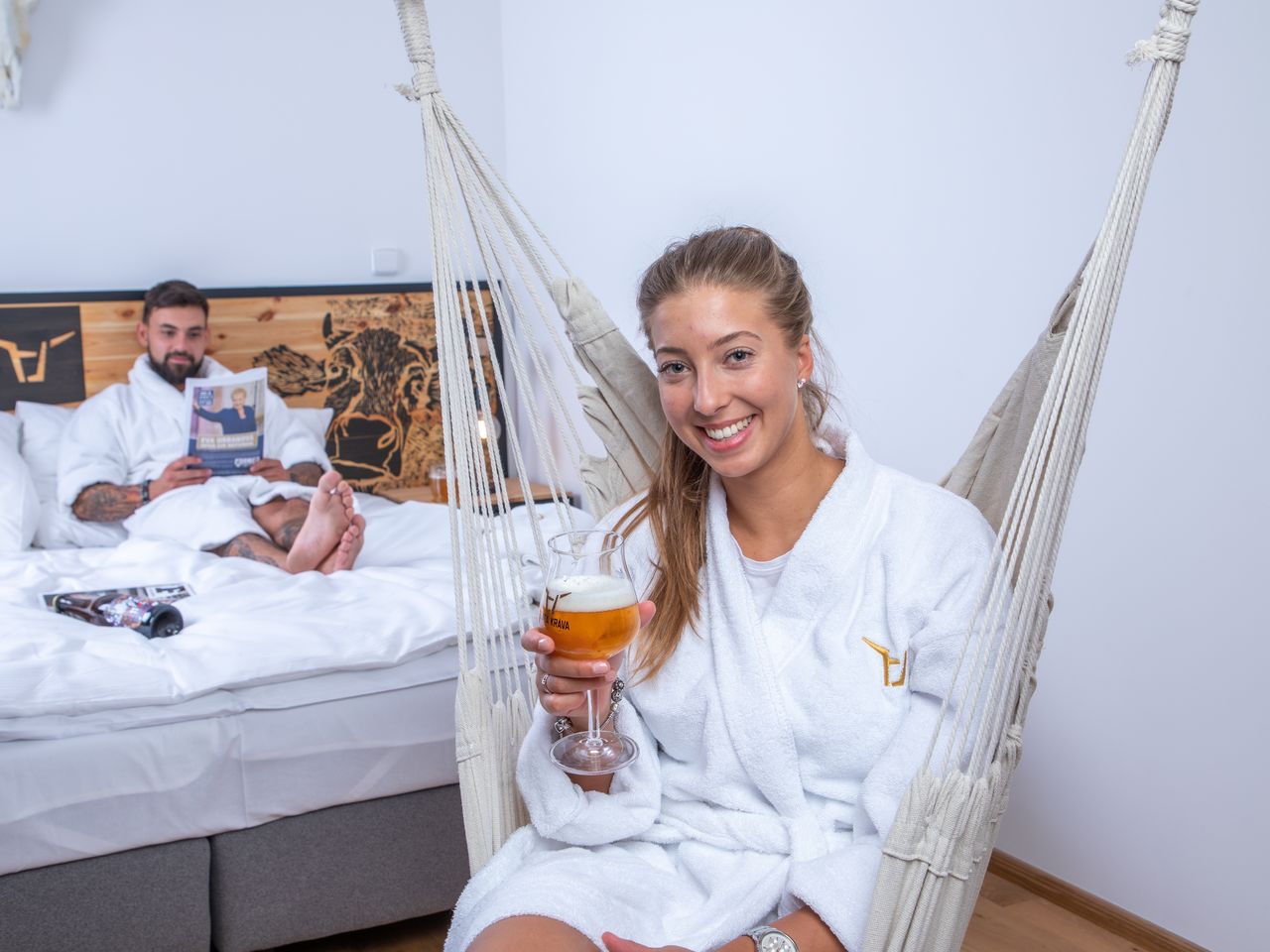 Designzimmer mit Zapfhahn direkt im Zimmer, benannt nach den Bieren der Bauernbrauerei Zlatá kráva (Goldene Kuh), werden Sie durch ihre Einzigartigkeit überzeugen! Jeder Raum hat seine eigene unvergessliche Atmosphäre und Geschichte. Sie können zum Beispiel den goldenen Saft im Deluxezimmer bei Sonnenuntergang auf dem Balkon oder in der Schaukel genießen oder direkt auf Ihrem Zimmer ein Bier zapfen.